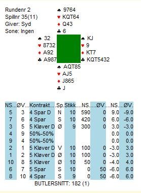 I 2. runde av helgens batalje satt Petter (N) og Tommy (S) mot Vestnesingene Torbjørn Amdam (V) og Gunnar Ødegård (Ø). Tommy i syd åpnet i 1 spar til pass og 3 kl hos makker som viser 7-9 hfp og 4+ spar. Gunnar Ødegård i Øst valgte nå å doble denne meldingen. Det er kanskje bedre å melde inn 4 kløver direkte på disse kortene, men er avtalene på plass går det vel å doble også....