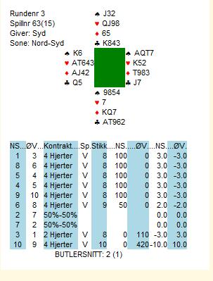 Tommy i Syd som nå har en makshand (14 hfp) valgte nå å melde denne som en minimumshand og meldte 3 spar . Etter systemet kunne han ha meldt 3 ruter, som viser tillegg og interesse for 4 spar med maks hos makker, men siden det ikke blir gjort har makker en obligatorisk pass. Denne gangen ble det skjebnesvangert. Videre meldingsforløp gikk dermed pass, pass og 4 kløver hos Gunnar Ødegård. 4 spar fra Tommy var selvfølgelig for sent nå, og Torbjørn Amdam hadde ingen problemer med å melde stampen 5 kløver.