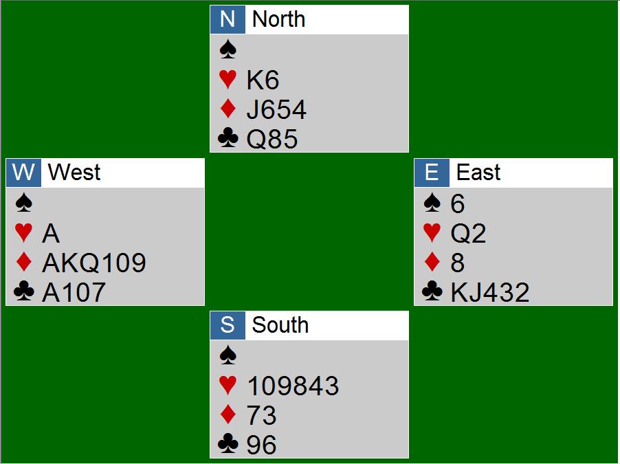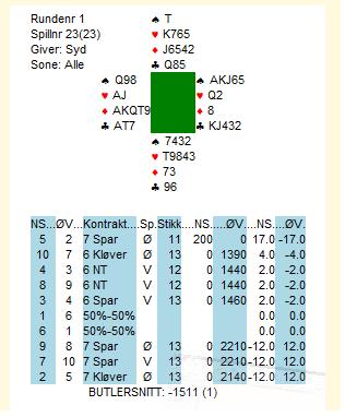 Utspillet var spar 10 og på 4 ganger spar har ingen de helt store problemer, men på fortsettelsen blir det krise for Nord. På tre ganger ruter og stjeling av den 4 og hjerter hjem var Nord ferdig. I digrammet ser en også at i 7NT så hadde det holdt og spilt spar 6. Da kan også Nord bare pakke sammen.