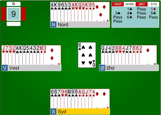 Haramgutten satt øst og var rimlig godt fornøyd med at Espen i Nord hadde kommet i 6 kløver etter et noe presset meldingsforløp. Etter utspill av spar seks så det jo nokså lovende ut. Espen stakk med trumf på hånden, la ned kløver ess og renonsen hos Tommy i Vest kom for en dag. Her er det flere som sløvt ville gitt opp og spilt seg for en beit, noe to par faktisk gjorde. Men - kontrakten står bare du klarer å sniffe opp fordelingen som skal til i Øst for at du har 12 før motparten har 2. Espen vurderte det slik at utspillet var ekte (norsk) og gikk derfor for følgende kortføring med trumreduksjon og barbering av Petter. Frem til denne posisjonen hadde Espen etter kløver ess spilt; Hjerter ess og konge og hjerter til stjeling, spar til stjeling og tre ganger ruter med spart til stjeling hjem. Da har vi posisjonen i diagrammet under....