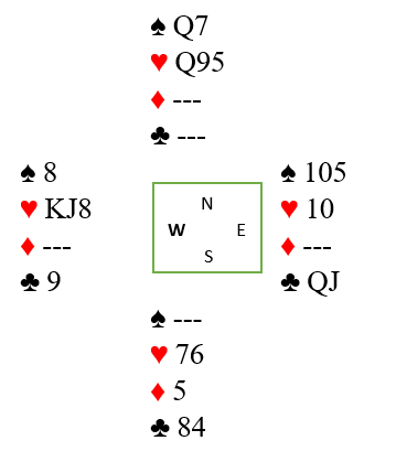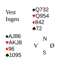 . Atle fortsatte med hj K og liten trumf til bordet. På kl 4 la Nord lavt og Atle det samme så jeg fikk på 9-eren. Ruter gikk så til stjeling og da liten kløver ikke felte noe fra Syd kunne ikke kontrakten lenger vinnes.