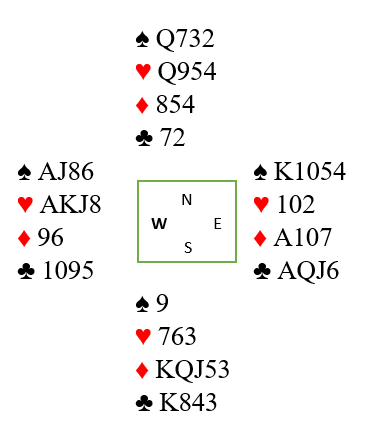 Ved noen bord gikk Øst innpå med 1 spar i 1. runde og det førte til at man ble presset opp til 5- trekks nivå. Atles hopp til 3 ruter var mini- splinter, singelton og god støtte (4+) i hjerter og 4 spar fra Arild var renonsvisende cuebid. 5 kl er cuebid (1/2 kontroll) og da Arild ikke hadde kontroll i ruter ble det brems i 5 hjerter. Ru A ut fra Vest og så skift til kl 8 som dri knekt og konge. Hvordan ville du spilt for å berge 11 stikk. Det er jo taper til trumf ess så flere stikk kan du ikke tape. Men hvordan få 11 vinnere- det er det som prøven gjelder. Kan du spille to runder trumf? Anta 2-2 imot, men 3-1 eller 4-0 forekommer også som mulig. Saken er at to runder trumf bare gir 10 stikk selv om 2-2 finnes (2 sp+ 2kl+ 1 hj+ 5 stjelinger). Altså må annen medisin til, godspille sidestikk eller få flere stikk i trumf på krysstjeling.