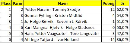 Utspillet fikk løpe til kongen på hånden hvorpå ruter knekt fikk løpe rundt til dama i øst som returnerte kløver oppigjen som alle fulgte til 10ern i bordet. Siden 2 kløver viste begge major (5-5) og det ikke kom ruter ut er det nå sansynlig at kløveren sitter 4-1. Dermed - Ruter konge til ess røff og liten. Inn på kløver i bordet og ruter 9 som fikk seile rundt og sto. Nå gjensto det kun å trumfe en ruter med kløver ess, spille bordet inn på spar ess og ta ut trumfen og 12 stikk var i boks. Et godt eksempel på et spill som vanskelig lar seg spille hjem dersom motparten ikke melder inn og sladrer i korta....