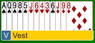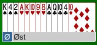 Øst åpnet i 1 ruter, 1 hjerter fra syd, og 1 NT fra Vest, dobler fra Nord. Lars Erik begynte å tenke om jeg skulle ta ut i 2 kløver eller 2 ruter. Bestemmer seg for å forsøke 2 kløver. Heldigvis så behøver han ikke å ta denne beslutningen, da syd melder 2 hjerter med pass rundt.