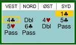 Til høyre for deg åpnes det med 1 kløver, og du har aldri vært noe pyse! Du melder 4 kløver som betyr; velg major makker. Meldingsforløpet går videre som vist i diagrammet under.