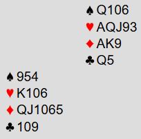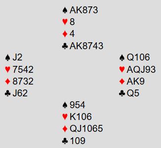 Etter den mislykkede starten på motspillet gikk det kjapt. Hantveit stjal ruter konge i stikk to og spilte A-K i spar, så A-K i kløver fulgt av nok en kløver. For å få mer enn for trumfdamen må øst i den situasjonen stjele med mastertrumfen sin og ta for hjerter ess, men det gjorde han ikke. Den tredje kløveren ble stjålet hos syd, så ruter dame og bort med hjerter 8. Ett trumfstikk var alt Ø/V fikk etterpå, Norge +650.