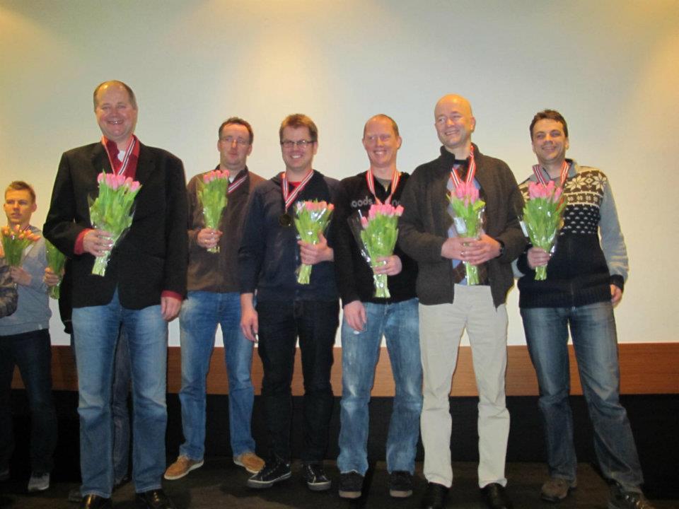 Det velspillende Vestfoldlaget. Fra venstre: Kjell Otto Kopstad, Jan Tore Berg, Gjermund Rekstad, Petter Tøndel, Ole Kopstad og Odin Svendsen. Foto: Ingen Hjellemarken, NBF.