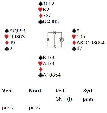 Fikk første stikk for hjerter 10, men luktet 3-3 fordeling i hjerter. Trengte å få stjelet 2 kløver og spilte så kløver Q. Øst gikk opp med A og spilte kløver opp igjen som ble stjålet med spar 4. Hjerter til A og ny kløver til stjeling, men med hva? Syd har igjen K 10 7 5 3 i spar hjerter 6 og ruter 6 3. Nord Har A Q 6 og hjerter K J samt A J 10 x i ruter. Hvis jeg stjeler med spar 6, vil jeg ikke få kommet inn for å ta ut trumfen, hvis den sitter 3-1. Trumfet derfor med spar A, og spilte spar Q og liten. Ingen J, men går man for topp så går man for topp. Fisk med spar 10. Ut med trumf. Hjerter opp og avkast av ruter på 13 hjerter. 12 stikk.
