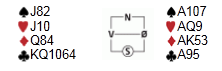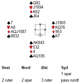 Teori og praksis er ikke alltid sammenfallende for oss bridgespillere, desto mer artig er det da når man følger teorien og får det til å stemme i praksis. Jeg spilte 3NT i øst i spillet under, etter at syd hadde fått vist en svak 6-korts hjerter utenfor sonen. Liten hjerter kom ut, og ned kom bordet: