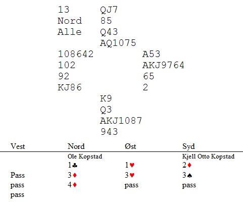 Kopstads hadde løsningen på denne også. Ole i nord spilte ut hjerterdame og hjerter knekt som Kjell Otto stakk over. "Hvordan visste duat det var rett?", spurte jeg. "Jo, vi spiller Runinow, den laveste av to inntilliggende honnører. Når makker avviker fra det, betyr det at han har to honnører dobbel. Enkelt og en beit."