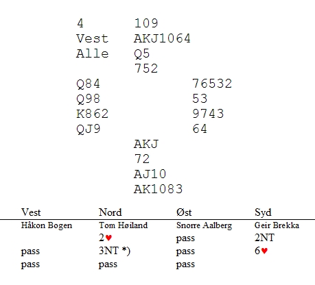 Når spillet var ferdig, kom det for en dag at Tor ikke hadde kløver, men hadde meldt 1NT naturlig. Da mente vest at hvis han visste at det var sparhold bak han, ville han kun invitert til utgang, ikke hoppa til 4hj. Han sa også at makker ville ha passa invitten. Jeg tror ikke noen spurte hva Rune Hauge ville meldt over 3hj, men 4kl ser da ikke dumt ut? Står det ikke nesten 5kl i syd?