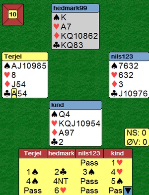 italia meldte lett 6sp på det samme spillet. Legg merke til 4ru som renonsvisende i hjerter. Dette for at åpneren skal ha to muligheter til å si hvor godt renonsen passet. 4sp betyr at "det suger", men 4hj sier at "det er ikke helt galt, men jeg kan ikke gå på til slem alene enda.."