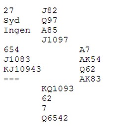 Øst åpner i 1 NT med pass rundt. Utspill Hjerter 10 til liten-liten og damen. Så spar til tier, liten kløver til damen, liten ruter til kongen, og liten ruter fra Thor Dag som spillefører ikke klarte å legge damen på. Resultat tre beit (!) etter en god lasj i utspill og underspilling av ruter E.