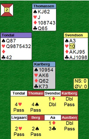 Det var mange interessante hender, hvorpå undertegnede og Ole har funnet ut at man må gjøre noen justeringer på systemet. Det er ofte man dukker opp i situasjoner som gjør ting vanskelig, disse situasjoneene burde man analysere, samt se om det er noe man kan gjøre for å ta tak i dem. Jeg har hele tiden sagt at man ikke må diskutere posser basert på hender, dvs akkurat den hånda man har forran seg osv. Det man derimot kan diskutere/justere er situasjoner som oppstår, dvs når motparten melder inn det eller det, eller når man sitter å spiller et motspill, ikke analyser det ene spillet alene, men diskuter hva de forskjellige kastene skal vise. Igjen på et generellt nivå, ikke HÅND FOR HÅND.