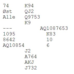 Nå så det greit ut å ikke ha åpnet i 4spar og jeg hoppet til 3sp som sperr. Etter pass, pass valgte nord 3NT!