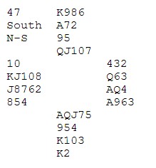 Svein Gunnar spiller ut ess, konge og dame i spar. Jeg stjeler spar dame, for så å legge ned ruter konge, fulgt av ruter til ess og ruter til stjeling. Om man ikke stjeler spar dame, vil det være vanskeligere å finne den aktuelle ruterstjelinga.