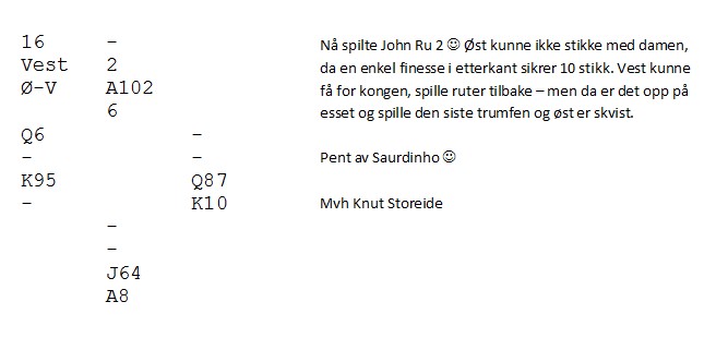 Ved de fleste bord kom tre ganger kløver ut, trumfet i bordet med åtteren. Øst stjal automatisk over med nieren, og nå var beste sjanse at Øst hadde dame-tredje igjen. Spar konge, spar til knekten, spar ess og ruter fra topp ga kontrakt.