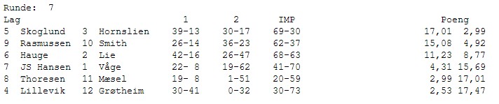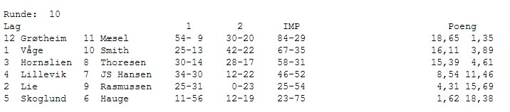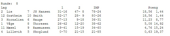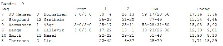 I B-pulja klarte Team Jansen å beholde 3 plassen, selv med et knapt tap mot bånnlaget i siste runde. Suverent på topp var Fredrikstad, som hadde vunnet alle sine kamper med klar margin, men i siste runde klarte team Skymoen en knapp seier . Vi får også ønske Vestby velkommen tilbake i A-Pulja. Team Buan fikk en knapp seier i siste runde, og plassen var vel allerede sikret. Derimot team Tveito hadde kniven på strupen, og hadde vanskelig motstand med Vestby i siste runde. En uavgjort kamp her reddet plassen. Desverre så rykket team Skymoen ned selv med seier over Fredrikstad i siste runde.