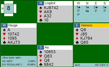 Under til venstre ser du meldingsforløpet til Baard Kåre Græsli og Kåre Bogø. De er et coming par som vinner masse både sammen og hver for seg. I mine øyne var de heldige som havna i toppkontrakten. 2ru fulgt av 3NT viste 25-26, men når han hoppet til 5sp over 4hj (overføring) måtte han kanskje enten ha telt feil eller oppdaget ekstra ressurser? (Du hadde da virkelig 28 hp, Kåre?)