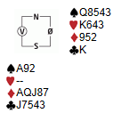 ØV skal spille 4 hjerter. Til tross for at du har begge minor og kan melde 4NT som forslag til minorstamp avstår du da det også kan være sjanser for bet. Du vet at makker ofte har firekort trumf, noe som er gunstig. Makker spiller ut liten spar, som du antar er singelton. Du spiller selvfølgelig spar tilbake til stjeling, men hvilket kort spiller du?