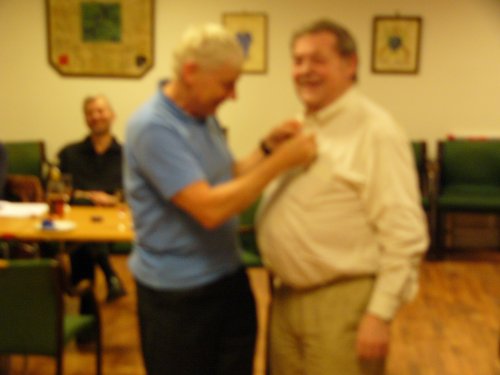 Tommy Sandsmark mottar sitt hederstegn av Leif Theodorsen, kasserer i NBF Oslo.