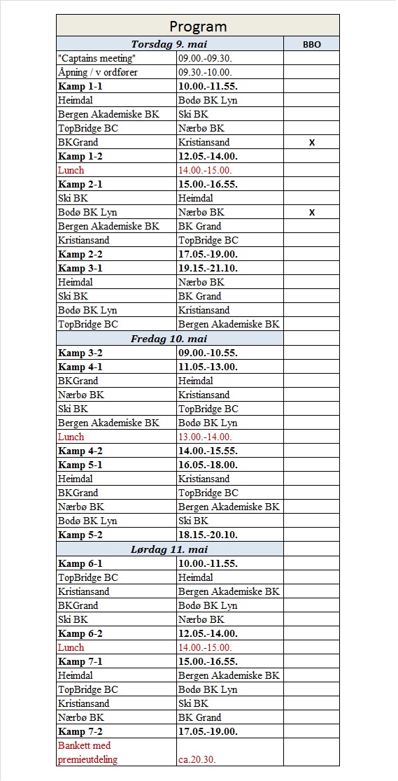 Programmet blir som følger for finaledagene. De to første kampene er det satt opp hvem som skal på BBO (se tabell). Deretter vil lederlaget sitte på BBO de siste 5 kampene.