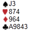 Etter å ha åpnet 1 ruter i 4. hånd meldte vest inn 1 hjerter. Nord meldte 1 spar og sør hoppet til 3 ruter. Nord spurte sør om hold med 3 hjerter, og syd plasserte kontrakta i 3NT. Ut kommer liten kløver.