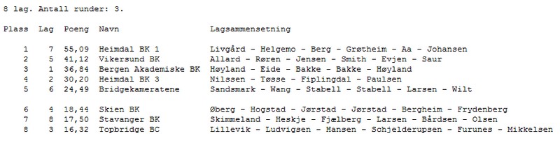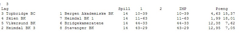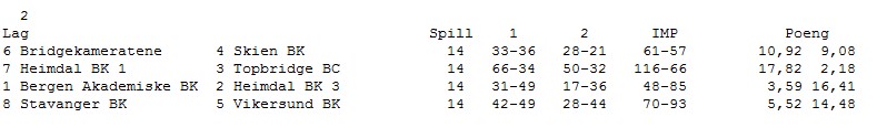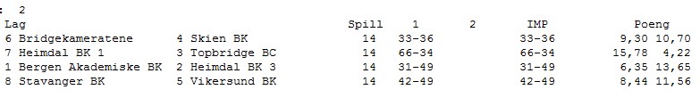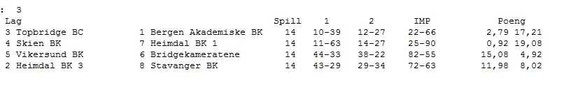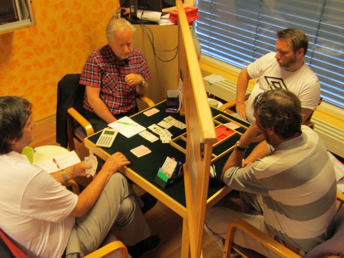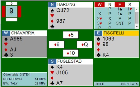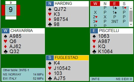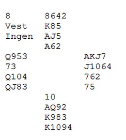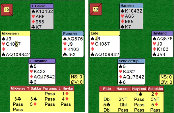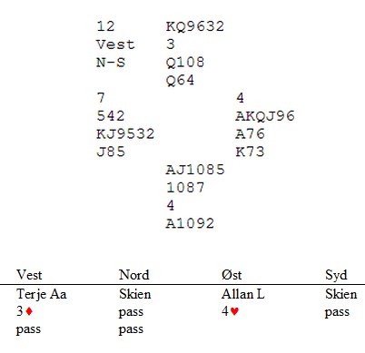 I åpent rom startet Øst med 1 spar, og Ellingsen i Syd hoppet inn med 3 kløver. Der døde det, og 100 ut for to bet så ikke bra ut. Det var fullt mulig for Ø-V å komme for høyt i hjerter. Men det skulle vise seg at frykten var ubegrunnet. Også ved det andre bordet åpnet Bakke med 1 spar, og Syd meldte 3 kløver. Nå doblet imidlertid Hegge negativt, og Bakke tok ut i 3 NT med pass rundt.