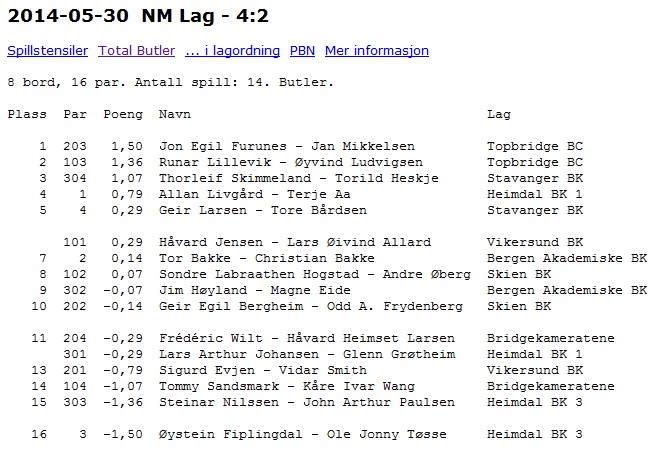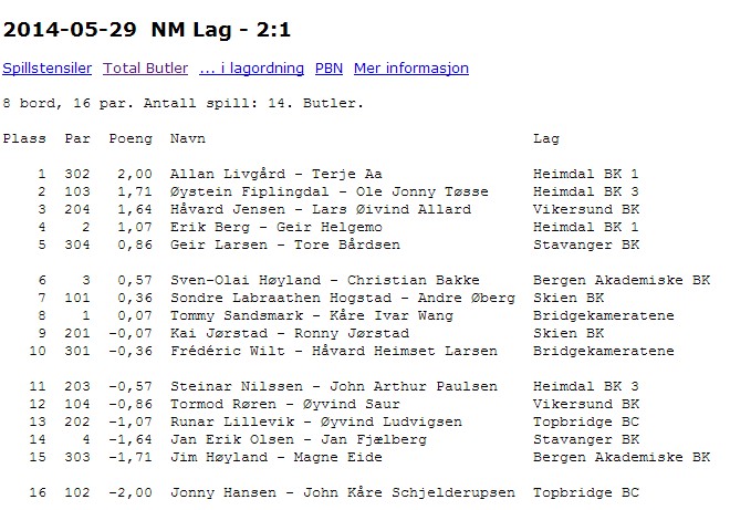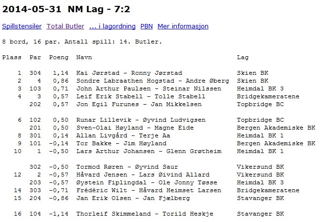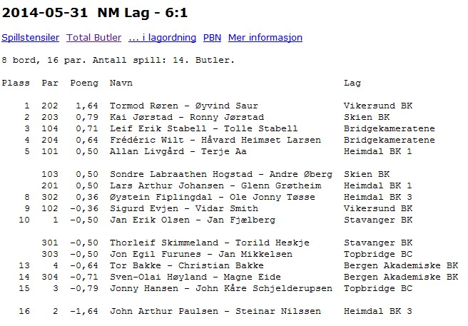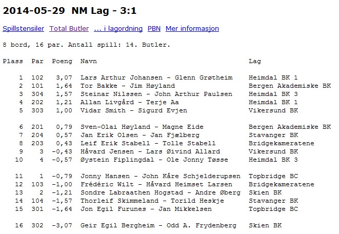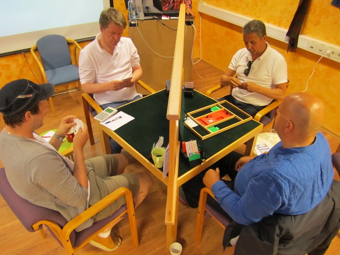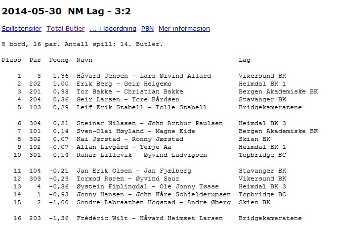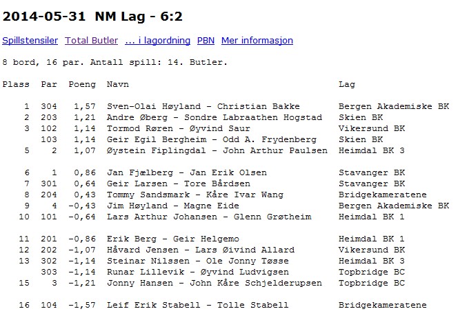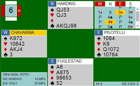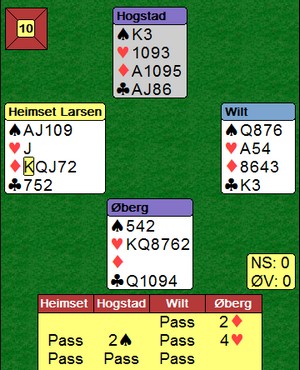 Syd servet en liten kløver, og tieren vant. Så fulgte hjerter til damen og hjerter ti til kongen og esset. Nord vred spar, og Christian Bakke tok fem stikk i den fargen. Blindemann holdt tre ruter og dobbel hjerter. Ruter ti ble dekket med knekten, og Christian brukte esset! Hjerter 9 satte inn Nord som var nødt til å gi bordet et rødt stikk og kontrakten. At det ble overstikk spilte egentlig liten rolle. Det ble 11 imp uansett. Snill sparsits men nydelig spilt!