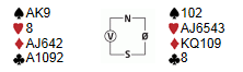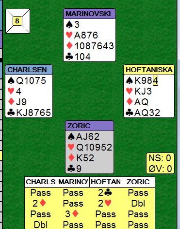 Glenn spiller ut hjerter 2 og finner makkers farge. Syd stikker og bommer ruteren, noe som ser naturlig ut. Mer hjerter som syd vinner. Han tar tre ruterstikk og spille kløver til knekten. På de to ruterne, kasta Lars Arthur to kløvere og har med det latt makker i stikken med holdet i begge svartfargene. Det kunne vært kritisk, men ikke når du har sånn oversikt som nordlendingen. I posisjonen over til høyre, tar han for hjerter 10, men IKKE hjerter knekt !!