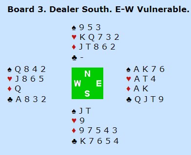 Øyvind Saur fikk sparkongen ut til esset. Han fortsatte med ruter til bordet og kløver til kongen (!). Han tenkte sikkert slik at hvis en var kort i kløver, var det sikkert syd som hoppet til 3sp. Nå kunne ikke 3NT vinnes lenger. På det andre bordet la Glenn Grøtheim ned kløveresset tidlig og da spilte resten seg selv. D10xx kunne fanges opp og en hjerter forsvant på ruteren. Hjerteresset satt foran kongen og +920. Den scoren tror jeg ikke mange slår.