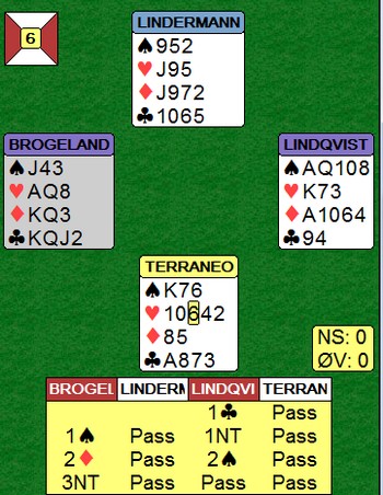 * Og der viser det seg at noe ureglementert har skjedd. Spillet er justert til 4 hjerter minus seks for Østerrike og Norge får 12 imp til! |
