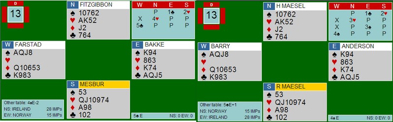 Her synes jeg Arve Farstad var veldig flink. Det er fort gjort å stikke makkers hjerter dame, men da står kontrakten. For det første godspiller han KJ hos spillfører og i tillegg vil han før eller senere bli innspilt i fargen og må gi bort enten på ruterkongen eller kløverkongen. Selv når han la lliten hjerter, måtte han bare gi opp kløveren og håpe at spillefører hadde singelton der. Det klarte han og Norge innkasserte ei beit.