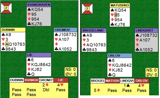 Det smalt allerede i spill to der Terje Lie tok vel mye Møllers tran. I alle fall når Nils hadde utstyrt seg med en helt ubrukelig hånd. Boye valgt å melde 5ru, en aksjon som ser rimelig naturlig ut. Også han fant en makker med kort som ikke kunne brukes til noe særlig. 800 + 150 i beiter og 14 IMP ut.