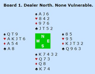 "Jeg liker ikke å skylde på andre enn meg selv, men allerede i spill 1 i kampen mot Italia fikk jeg en uggen følelse. Marianne og jeg spiller aggressivt, men i denne turneringa var det flere (mange) spill der vi rett og slett skulle holdt oss roligere. I aller første spill mot Italia (under) åpnet jeg tynt i tredje hånd med 1sp. Vest doblet opplysende og gjenmeldte NT etterpå. Øst løfta ut og Marianne i nord spilte selvsagt ut spar. Vest kom inn på damen og spilte fint når hun tok EK i ruter før hun gikk på hjerteren. (bedre enn EK i hjerter fordi det er en ruter mer tilsammen). Nå endte det med hele tolv stikk. Hvis jeg passer, vil vest åpne med 1hj og øst melder 1NT og vest løfter til 3NT. En liten spar og vi tar de fem første stikkene. Ikke som noen unnskyldning, men det var flere lignende spill.