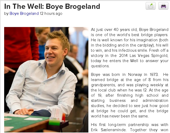 Med jevne mellomrom stiller en av verdens bridgepersobnligheter seg til disposisjon i 24 timer for å svare på spørsmål fra Bridgewinners.com sine lesere. Denne gangen var turen kommet til vår egen Boye Brogeland. Trykk på bildet for å komme til sida.
