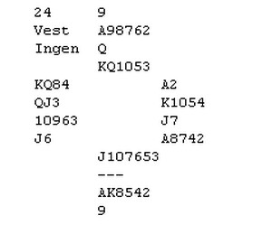 Ved vårt bord gikk meldingsforløpet p-p-2klø*-? Vi har veldig godt sys i posisjonen hvor makker svarer 2ru på OD med 0-7, der med tenkte jeg at på alle andre svar var jeg i utgang. Valgte derfor å doble i stedet for den mer normale 2NT på mine 16 gode HP, Så når det da gikk x-p-2ru-p, måtte jeg melde 2hj, som kun viser 4kort hj og en normal OD, makker kunne/burde(?) Kanskje meldt 3ru første gangen nå ville 3ru bare vise lengde og forsøk på å bedre kontrakten. Vi kunne begge valgt å melde annerledes ved første anledning i sum ble forsiktigheten behørig straffet med 10 imp ut! Så som Tor og Geir sier NT er NT og det å gjøre Bridgen enkel er gode regler!