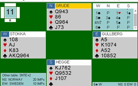 I sluttspillet mot de hardt og ikke minst velspillende Øst-Europerene gjorde vi ikke så mange feil, men de vi gjorde var veldig dyre. Vi burde enkelt ordnet uavgjort i Bulgaria matchen på vår side, og da hadde sikkert neste dag utviklet seg annerledes. Polen matchen var svak fra begge par, i tillegg hadde vi også utur da vår glimrende 7klø mot polen ble belønnet med -16imp.