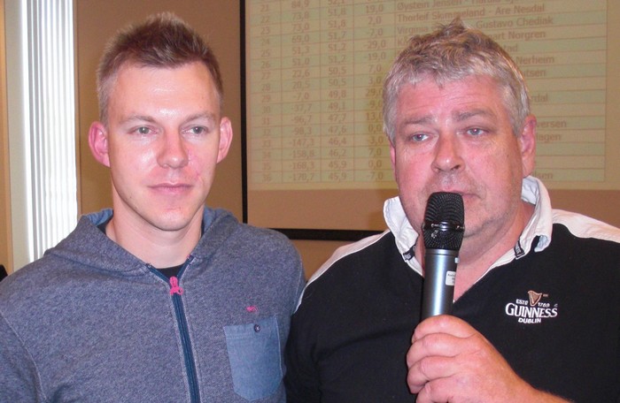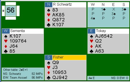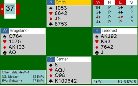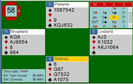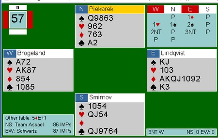 Jeg halshugde Thomas Charlsen i EM for å løfte 6kl til 7kl uten å være sikker på at trumfen var god nok. I dette spillet tok Espen mot til seg og meldte 7hj uten å være helt trygg. Spillene er overhode ikke sammenlignbare, for det er vanskelig å se for seg hva makker Brogeland skal ha for sin 5NT uten fin trumf. LIkevel, likevel. :-) Uavgjort spill forteller om at nivået er høyt.