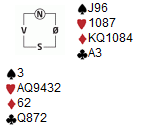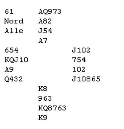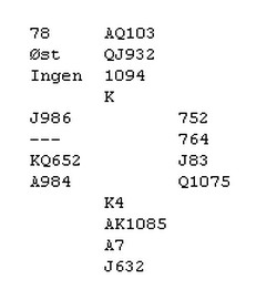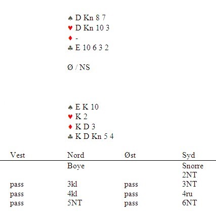 Jeg går for omtrent denne hånda: -,xxx,EJxx,Exxxxx. Han gir meg muligheten til å spille ruter hvis jeg ikke skulle ha god kløvertilpass. Du ser også at det er vesentlig å få kontrakten på min hånd. Det er noe som skurrer siden han kanskje ville meldt 3sp på denne hånda over 2NT, men søkte han etter 5-3 i hjerter? Når han ikke cuebidda over 4ru, men hoppet til 5NT må han vel ha en renons et sted? Det jeg i alle fall ikke har lyst til er å spille 6kl fra nord.