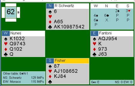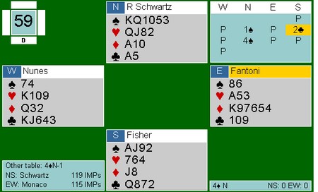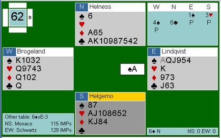 Som sagt så gjort,. men pasienten døde. Kløver 9 tolka Boye som at jeg hadde 98 i kløver og spilte fargen rundt til åtteren til spillefører. Påtrøkk de luxe og en elendig score for -110.