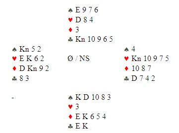 Jørn Arild får hjerteresset ut og skift til ruter. Han tar for KD i spar og fargen sitter singel til venstre og tre til høyre. Så ta han for EK i kløver og begge følger. Nå sier Jørn følgende. "Jeg spiller spar til esset og stjeler en kløver", samtidig som han lener seg fram og viser fram kortene et øyeblikk. Akkurat hva som skjedde videre, er jeg ikke 100% sikker på. Når en snakker med bridgespillere om slike ting, er det i alle fall ikke mulig å få et helt objektivt svar, men faktum er at når Jørn spiller spar til esset og kløver fra bordet, så følger øst med syveren!! Han tar kortene til seg og ber om å få spille ferdig spillet likevel.