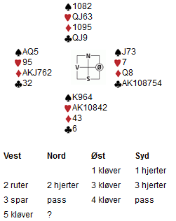 Nord spilte ut spar 4 og vi skulle finne en plan. Hvis hjerteren ordner seg med én taper, ser dette lyst ut. En ruter kan kastes på spar dame, og en kløver på den femte sparen, som kan godspilles med en stjeling hvis fargen sitter 4-2. Ruter ess er innkomst.