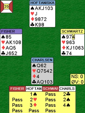 Her liker jeg meldingsforløpet der syd forteller om en innvitthånd med trekort spar. 2hj viser en udefinert singelton, mens 2sp kan passes.