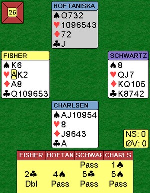 Thor Erik Hoftaniska og Thomas Charlsen spiller for engelske Janet de Botton og var på BBO i tredje runde. Kampen endte 23-23, ikke minst takket være denne tøffe slemmen av nordmennene.
