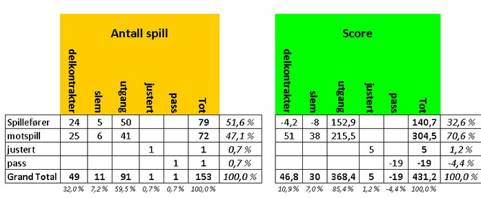 Jeg hadde trodd at et par som Nils og Terje var spillefører i mer enn 51,6% av spillene, men det var de altså ikke denne gangen. De andre resultatene er jeg ikke veldig overrasket over. De scorer +140,7 på egne spilleføringer, desidert mest når de er i utgang. De har minus på slemmene og det har jeg sagt noe om før. Selv vil de nok hevde at dette er tilfeldig, men jeg er ikke sikker. Legg også merke til at de har pluss på motpartens slemmer. Enkelt forklart: Også andre par melder for hardt.