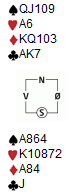 Det øverste meldingsforløpet er fra mitt bord og jeg er ikke sint, men skuffet. Å melde inn 3sp over 3kl kan selvsagt koste dobla beiter, men bunnen er like stor når makker spiller ut ruter mot 3NT. Blir det feil å aksjonere, har en i alle fall prøvd. Den sikreste måten å ikke vinne parturneringer på, er enten å gå beit i slemmer eller passe seg til fant.