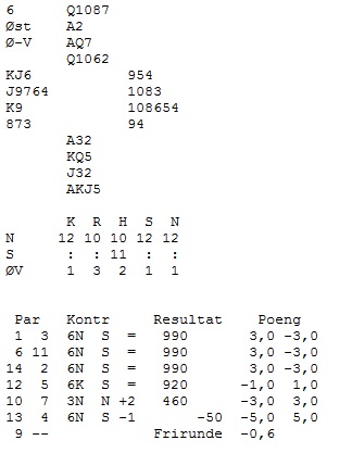 Bare to par stoppet før utgang, 6 par var i 3 NT av S med 11 stikk og 6 par i 5 kløver av S med 12 stikk, ett par fikk 13. Bare Anders Fugleneb (N)- Olav Erik Didriksen (S) fant fram til den flotte lilleslemmen 6 kløver. De meldte slik: