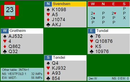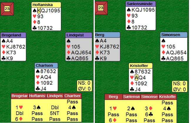 Thomas Charlsen spilte ut en spar til tieren som stod. Nå så det ut som det var minst ni enkle stikk, men 4-0 i ruter var ikke greit. Uansett måtte Silla godspille ruteren og inne på den fjerde fortsatte Hoffa med spar til singel ess i bordet.