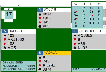 I 3NT er det opplagt å lasje ruteren to ganger og så seile hjerter ni. Skulle nord ha en ruter til, sitter fargen 4-4 og 3NT går enda hjem. Det blir beit kun hvis nord har hjerterdamen sammen med femkort ruter.